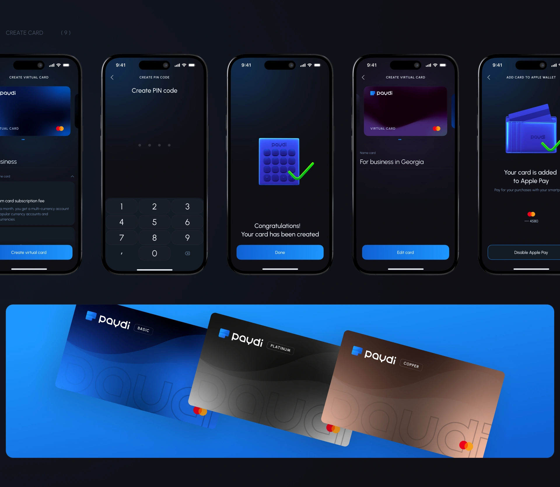 Branding was carried out from scratch: from naming and logo to a visual system combining the accessibility of fiat service and the advanced aesthetics of crypto-banking. The visual style reflected technology, reliability and trust, which is especially critical for financial products. We provided a great design for banking applications.